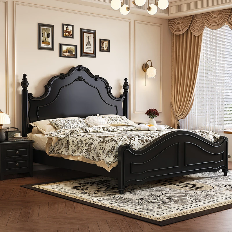 袋狮フレンチヴィンテージスタイル無垢材ベッド - モダンでシンプルなデザイン、1.5mと1.8mのダブルベッド、主寝室にぴったり収納付き高箱ベッド!アメリカンスタイルで、快適な眠りを提供します。