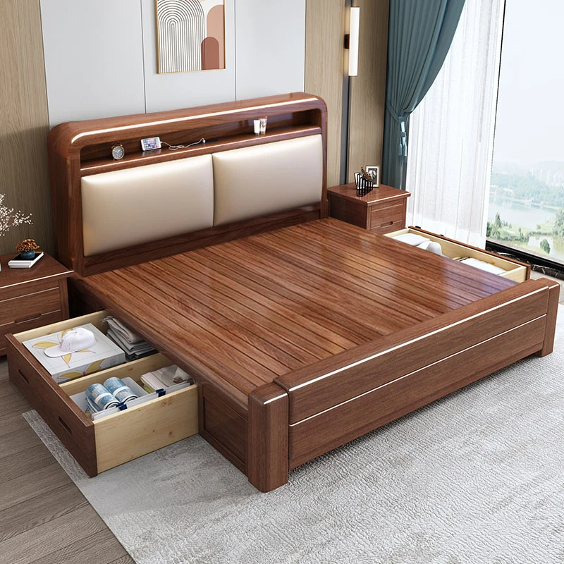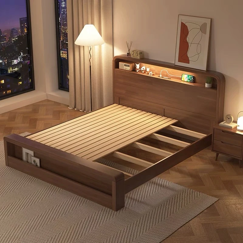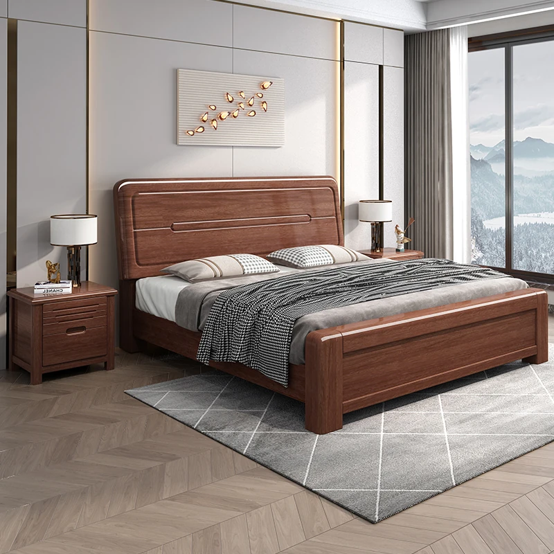 雅麦嘉の中式天然木製ベッド - モダンでシンプルなデザイン、1.5m & 1.8mサイズ!ナッツウッドの魅力的な寝室用ダブルベッドで、快適なひとときをお過ごしください。