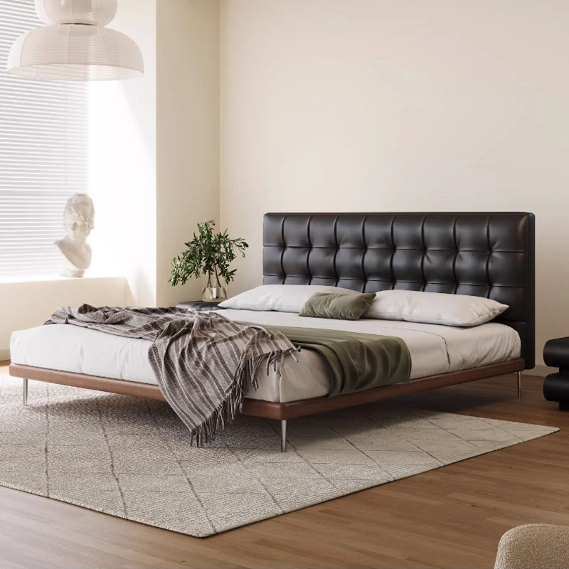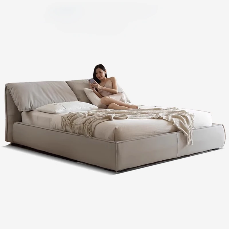 奈丘侘寂風軽奢真皮ベッド - モダンでシンプルな1.8mの天然木製ダブルベッド、柔らかいパッケージデザイン、インスタで人気のスタイル!快適な眠りを引き出す上質な一品。