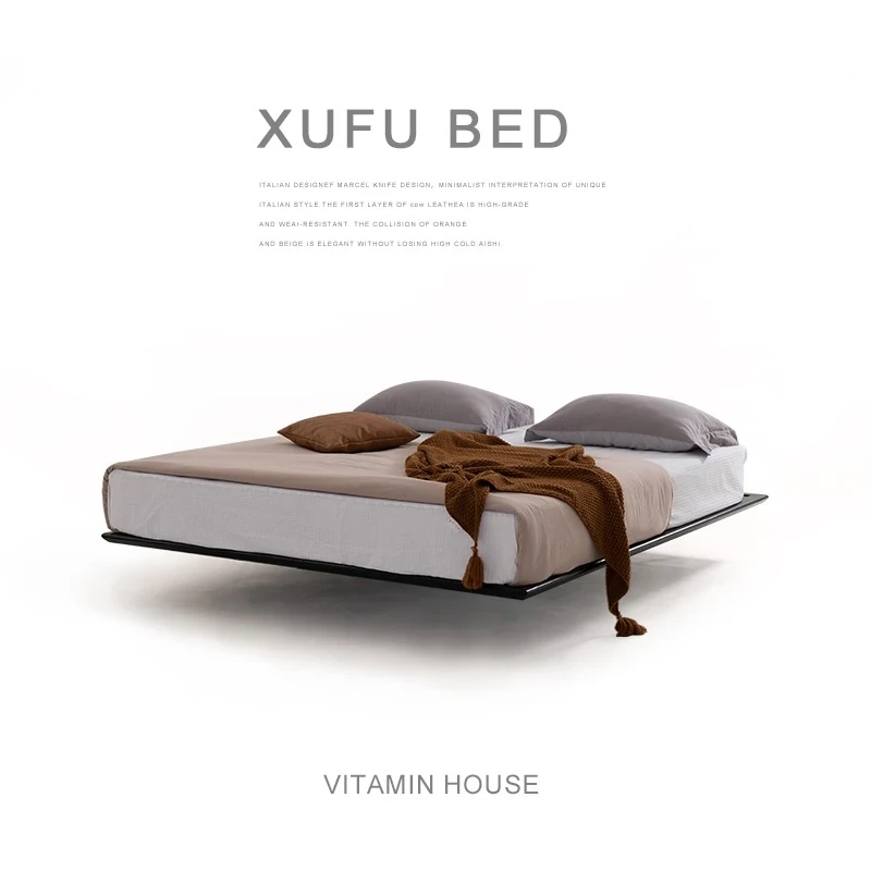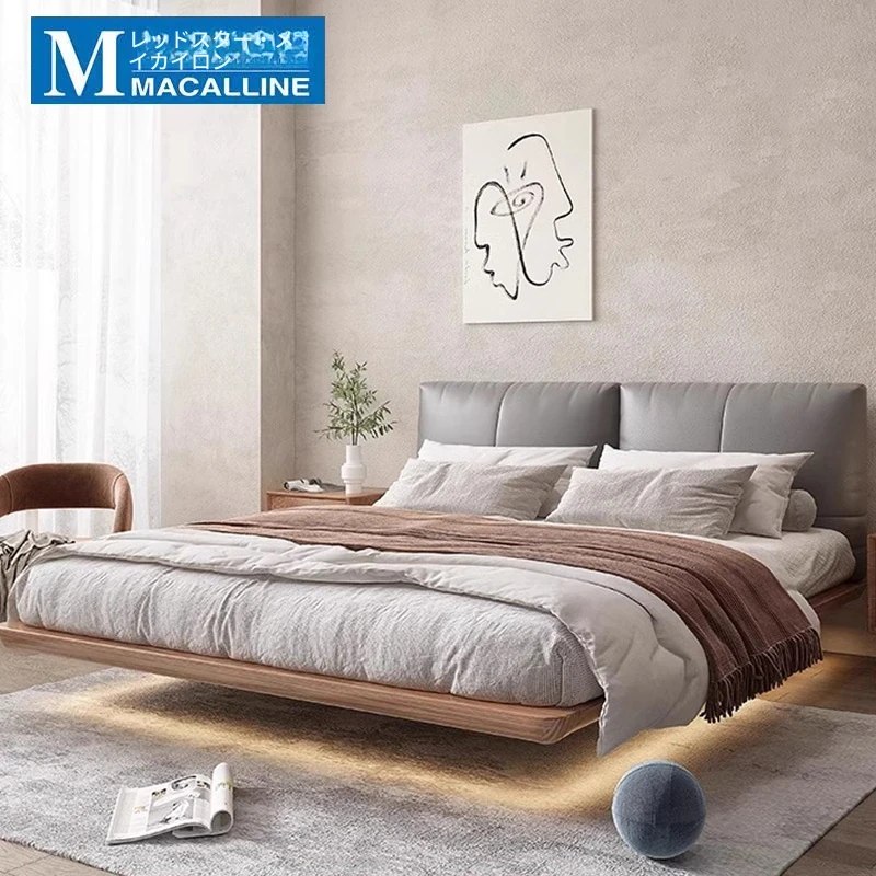 オーサンジェ本革の天然木製ベッド|モダンでシンプルな1.8m主寝室用ダブル浮遊ベッド・センサーライト付き|2024年新作登場!