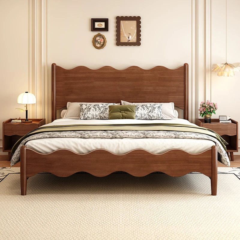 雅麦嘉の天然木製中古風ダブルベッド 1.5m & 1.8m 波浪型デザイン 現代的でシンプルなヴィンテージ風 結婚生活を彩る理想的な寝室の選択!