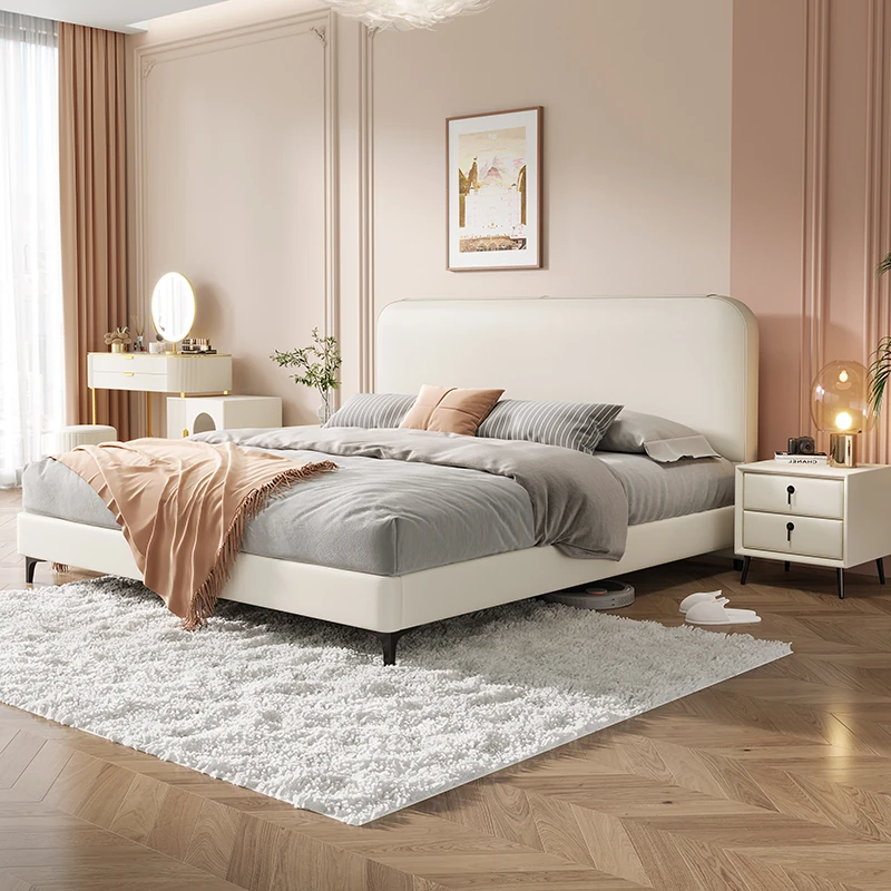 裕钦のフレンチクリーム雲のような1.8メートル現代的シンプル主寝室用本革ベッド、天然木製ソフトパッケージダブルベッド - スタイリッシュなデザインで、快適な眠りを提供します!