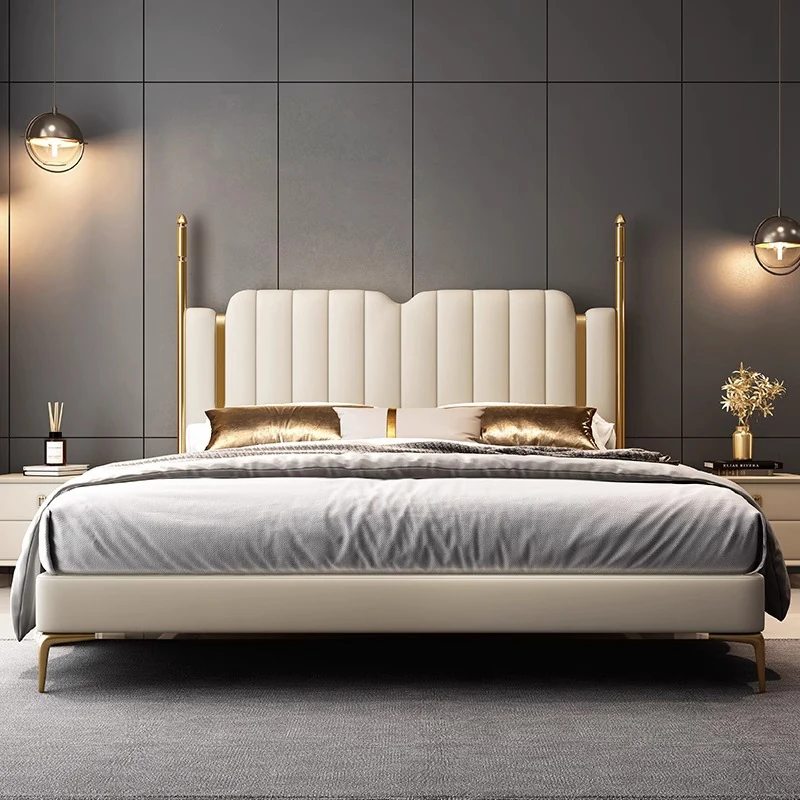 允馨イタリアンミニマリズム本革牛皮ダブルベッド - 高級感あふれるモダンレトロデザイン、実木使用で耐久性抜群!理想的な新婚生活を彩るシンプル&エレガントな一品です。