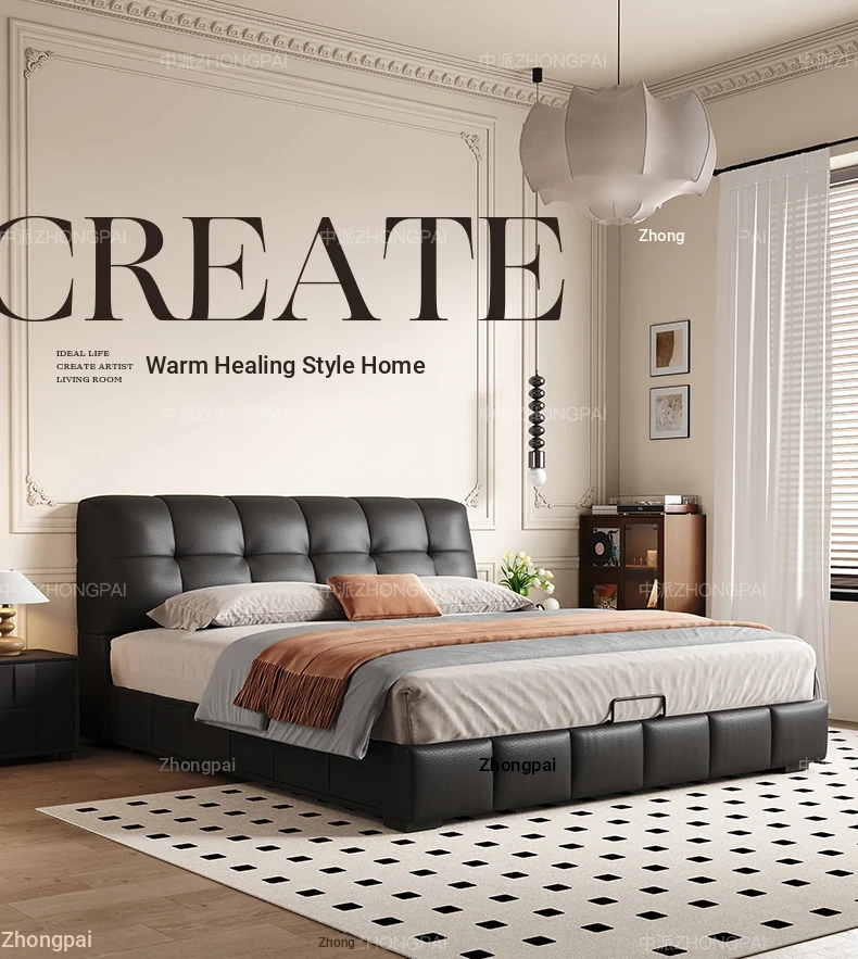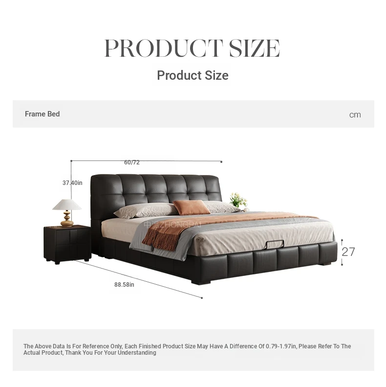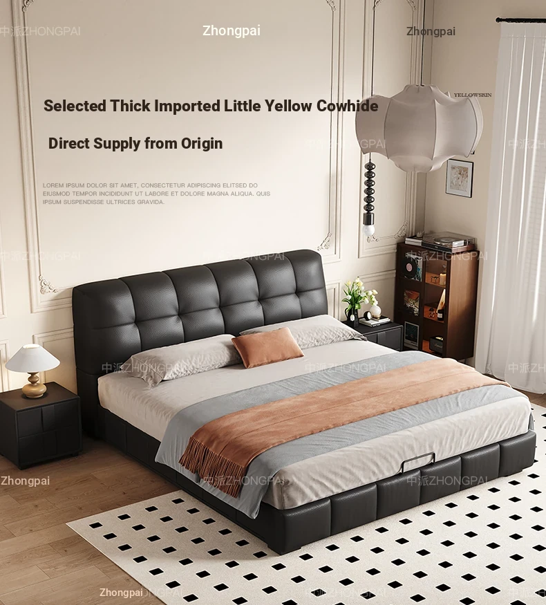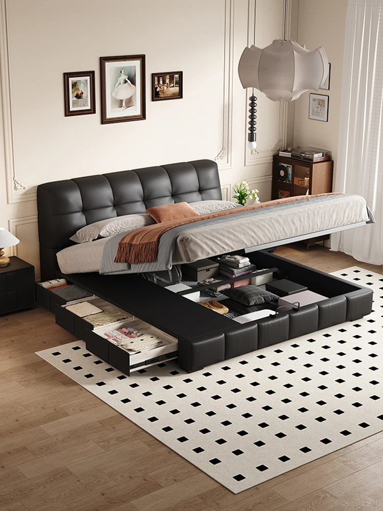 Sleek Italian Minimalist Puff Bed - 1.8m Genuine Leather Black King Size Marriage Bed with Storage for Couples - Perfect for Modern Bedrooms!
