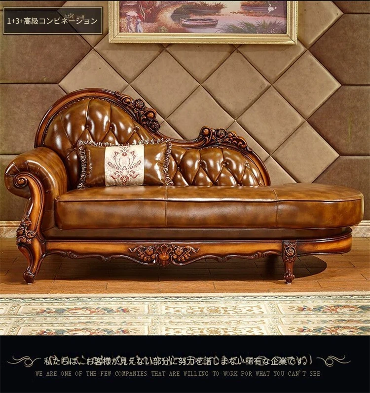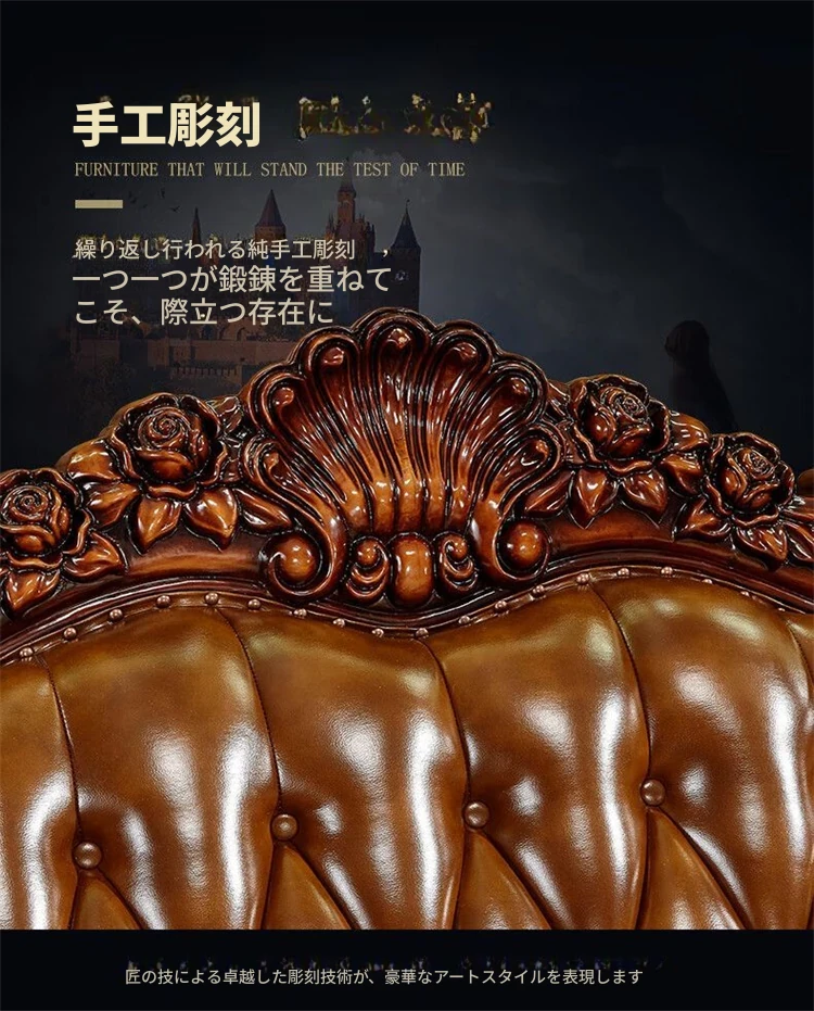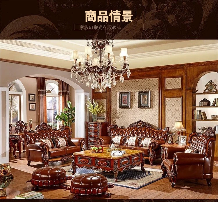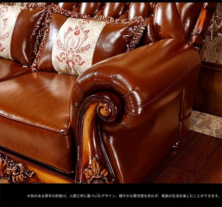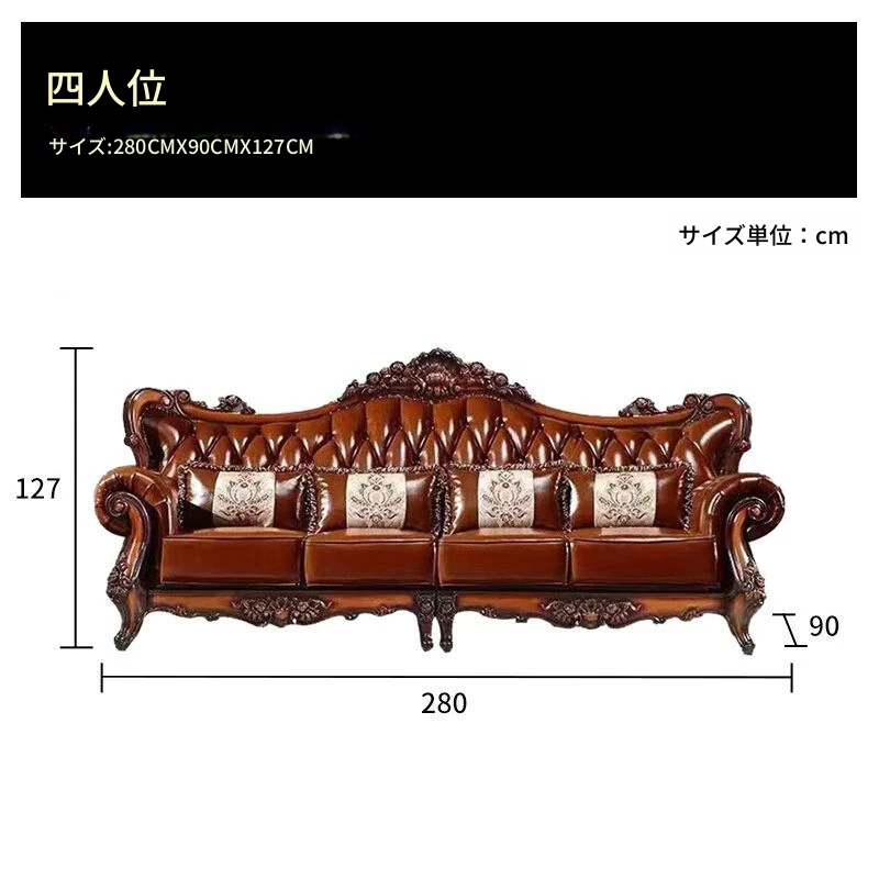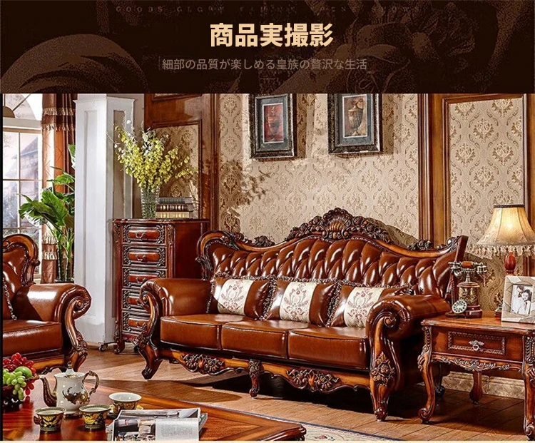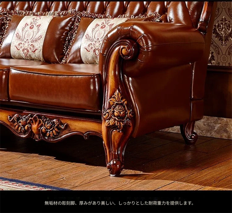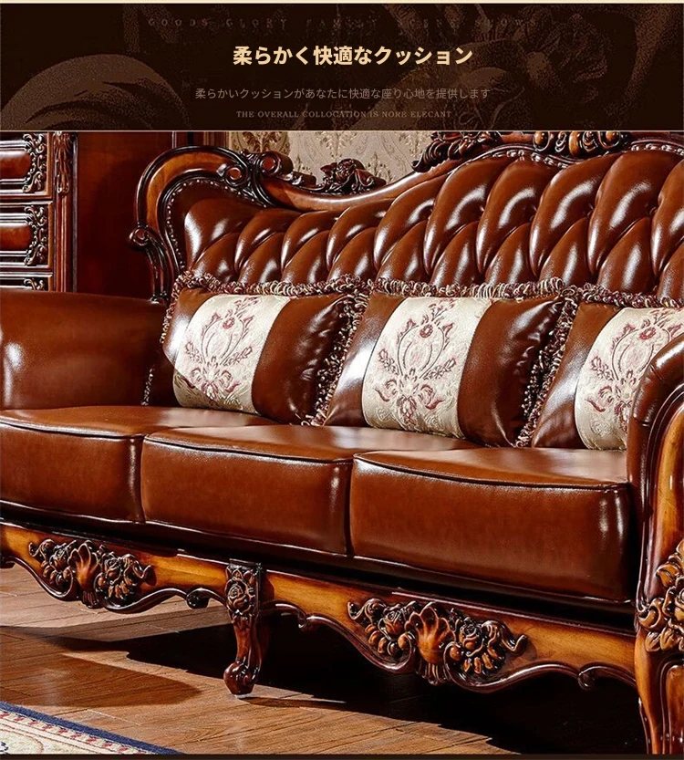 高級感あふれる欧風本革ソファ - 第一層牛革製、超大型客室向け!アメリカンスタイルの木製彫刻が施された別荘家具。快適さと豪華なデザインを兼ね備えた理想的なリビングルームの中心!