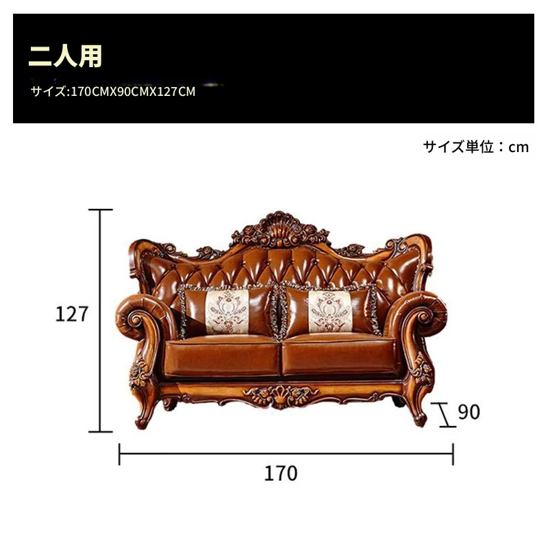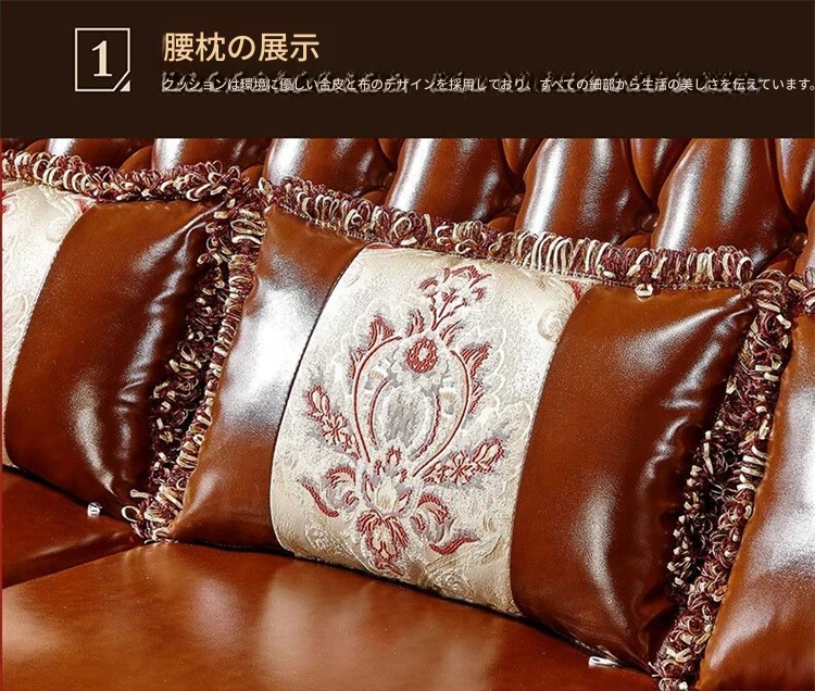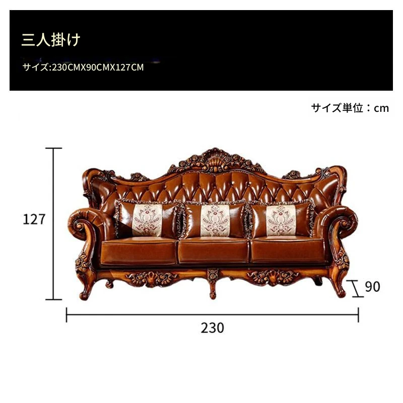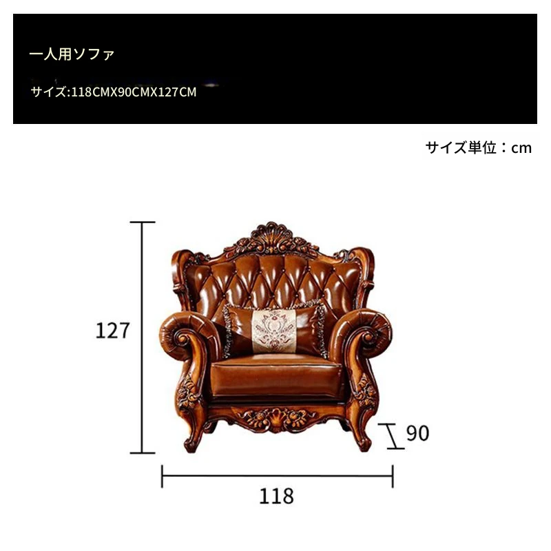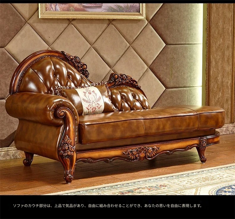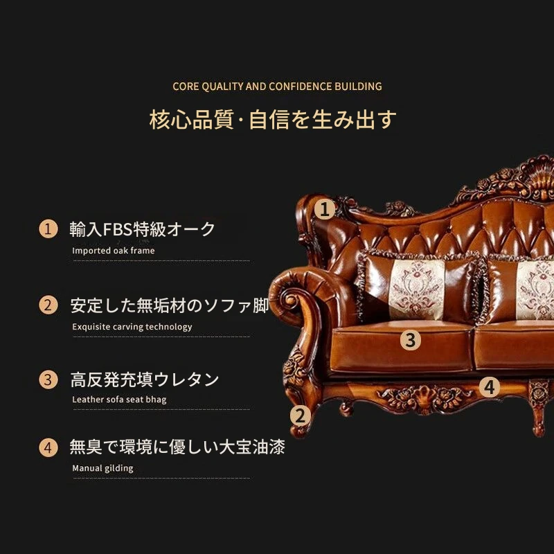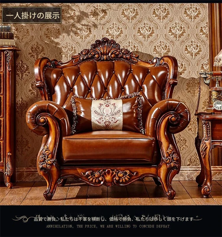 高級感あふれる欧風本革ソファ - 第一層牛革製、超大型客室向け!アメリカンスタイルの木製彫刻が施された別荘家具。快適さと豪華なデザインを兼ね備えた理想的なリビングルームの中心!