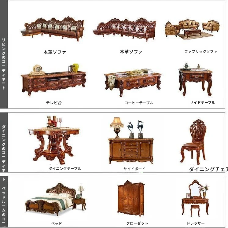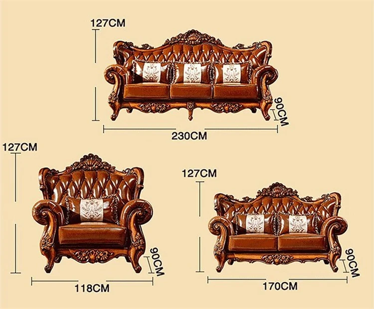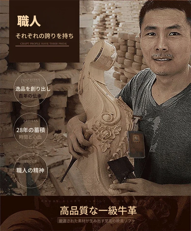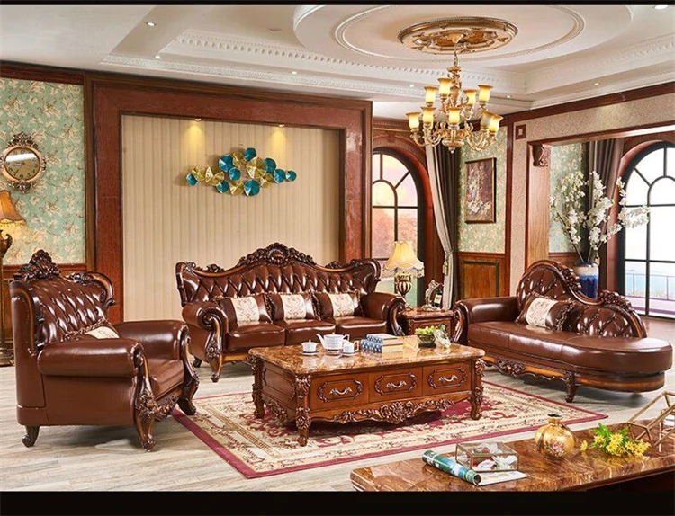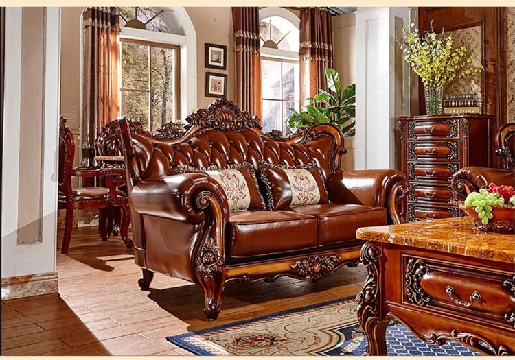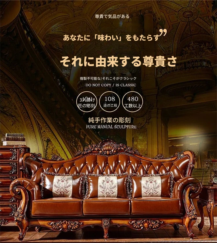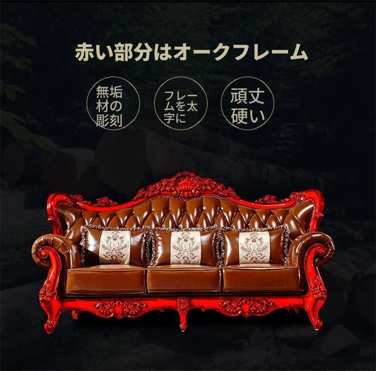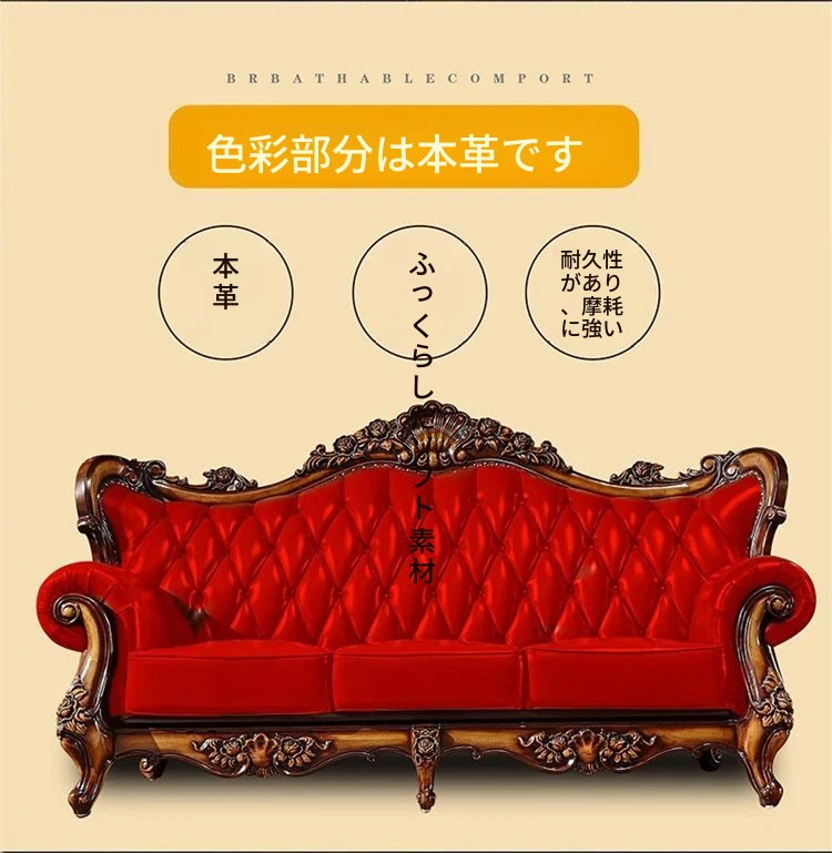高級感あふれる欧風本革ソファ - 第一層牛革製、超大型客室向け!アメリカンスタイルの木製彫刻が施された別荘家具。快適さと豪華なデザインを兼ね備えた理想的なリビングルームの中心!