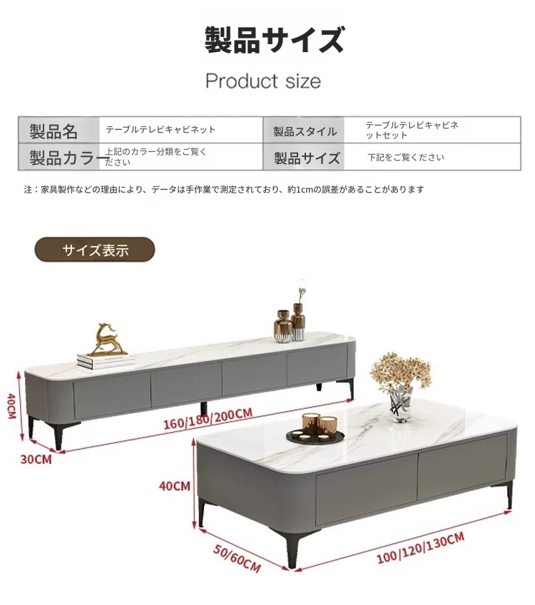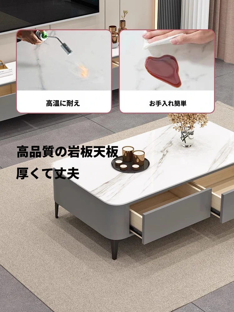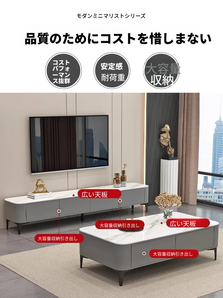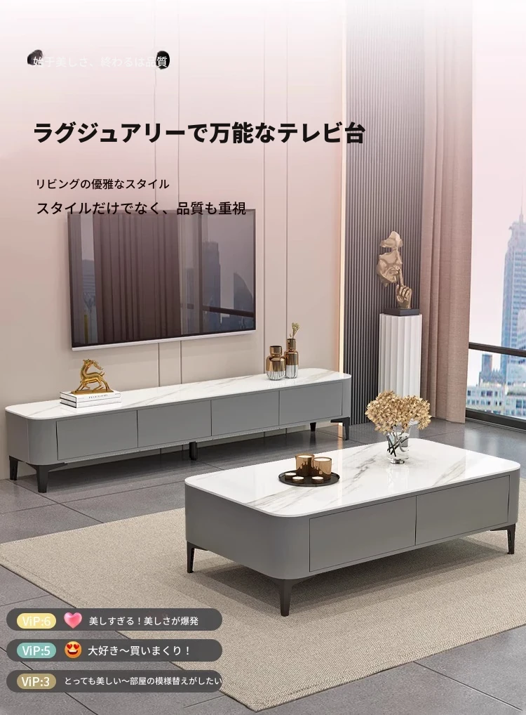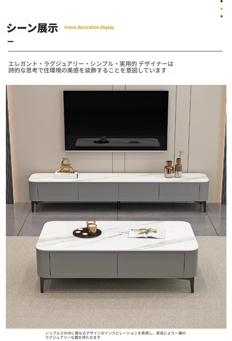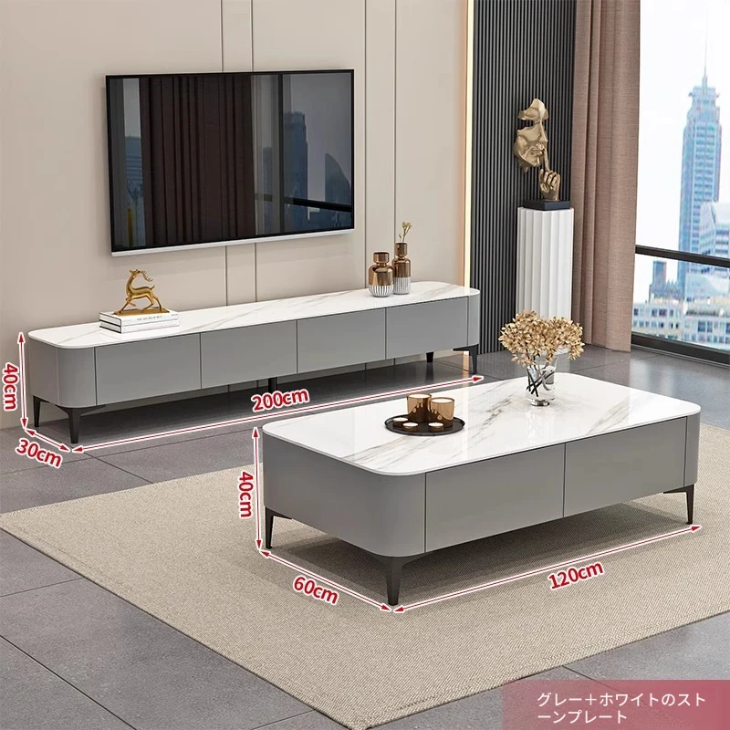 テレビボード1.8メートル+1.2メートルコーヒーテーブル【灰色+白色の丸角岩板】