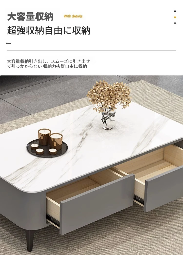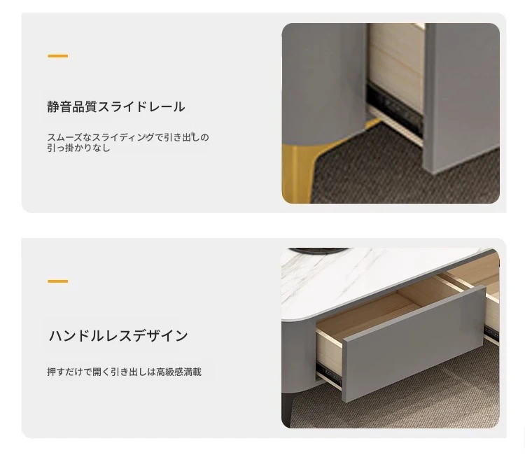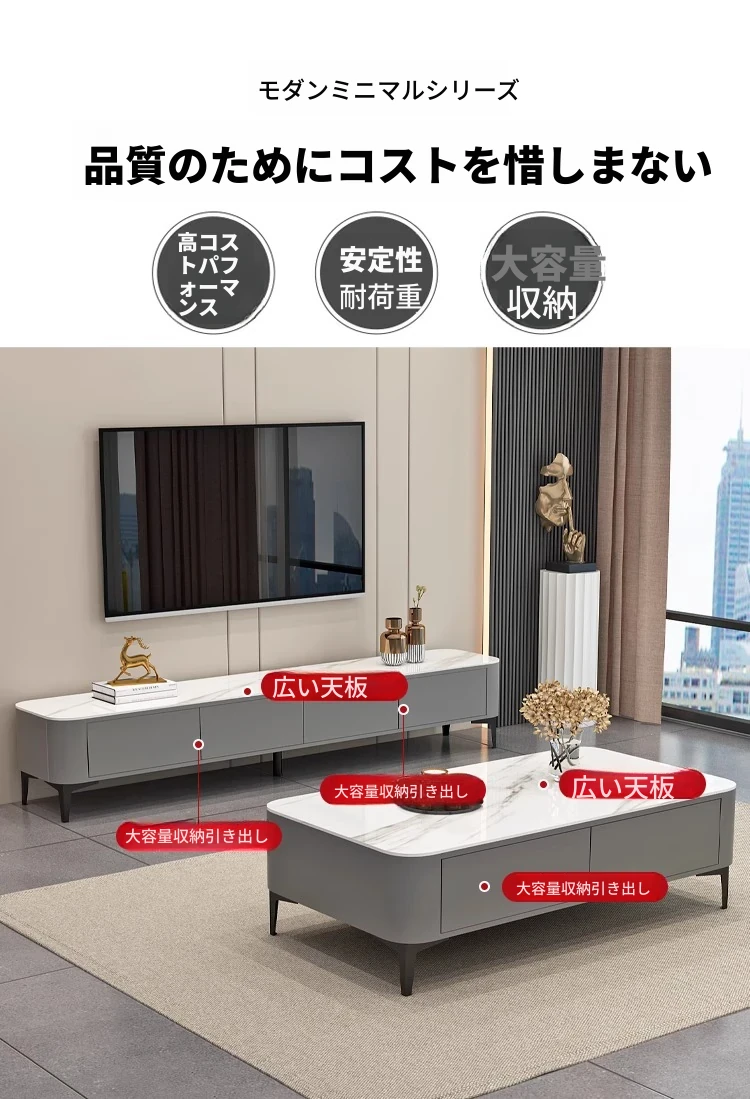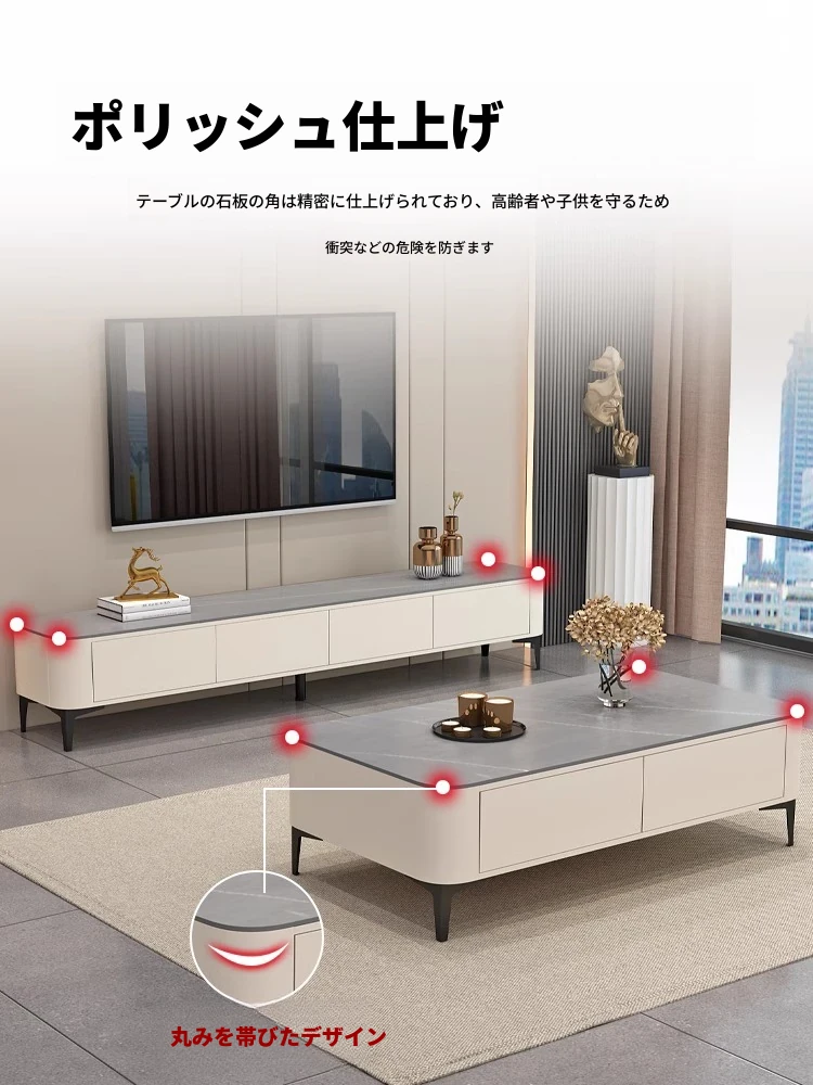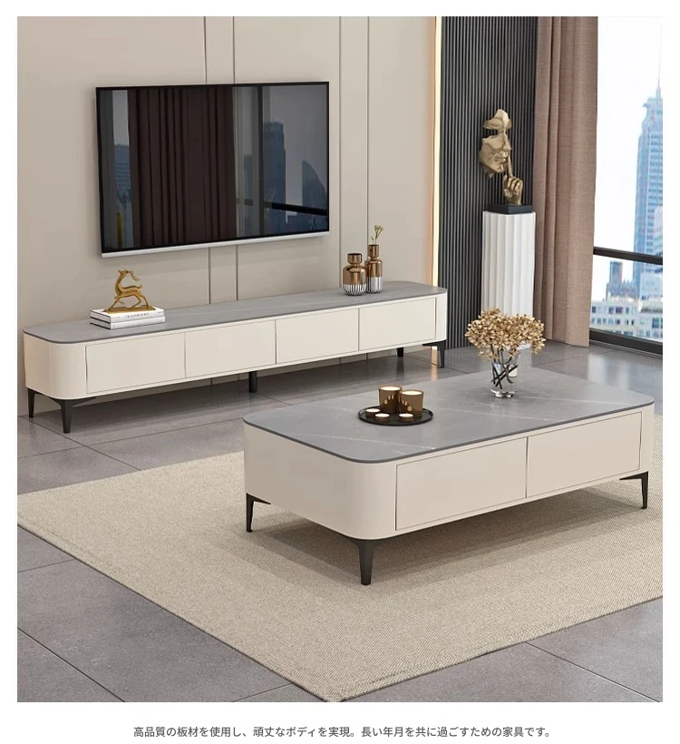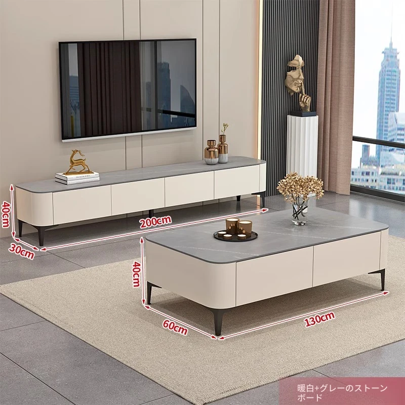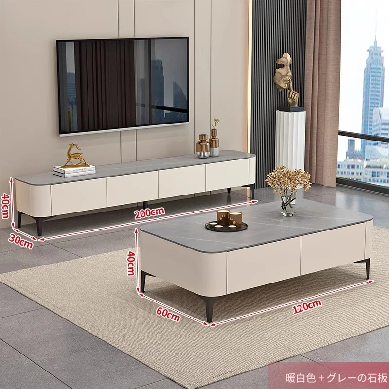 テレビ台1.6メートル+1.2メートルのコーヒーテーブル【ウォームホワイト+グレーの丸角石板】