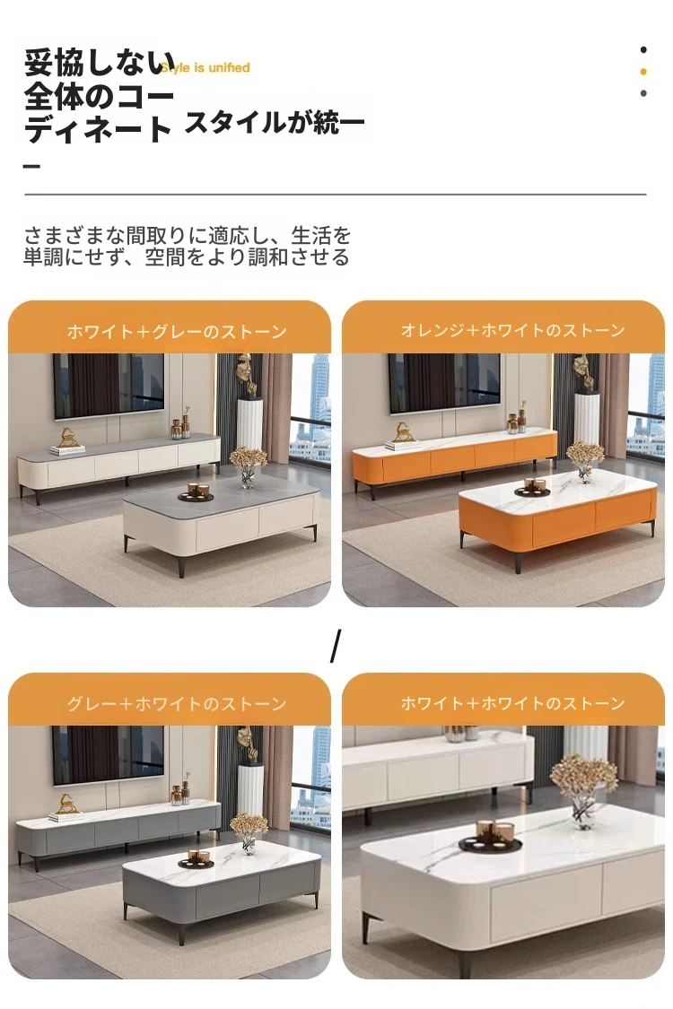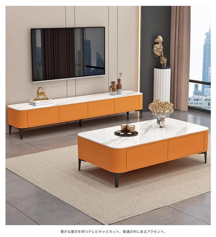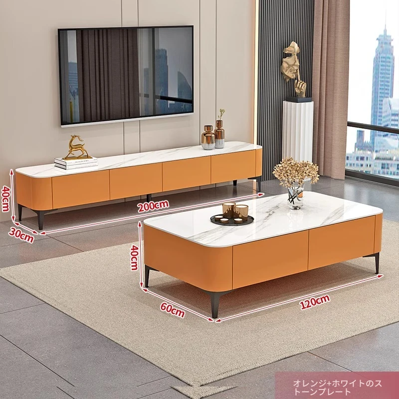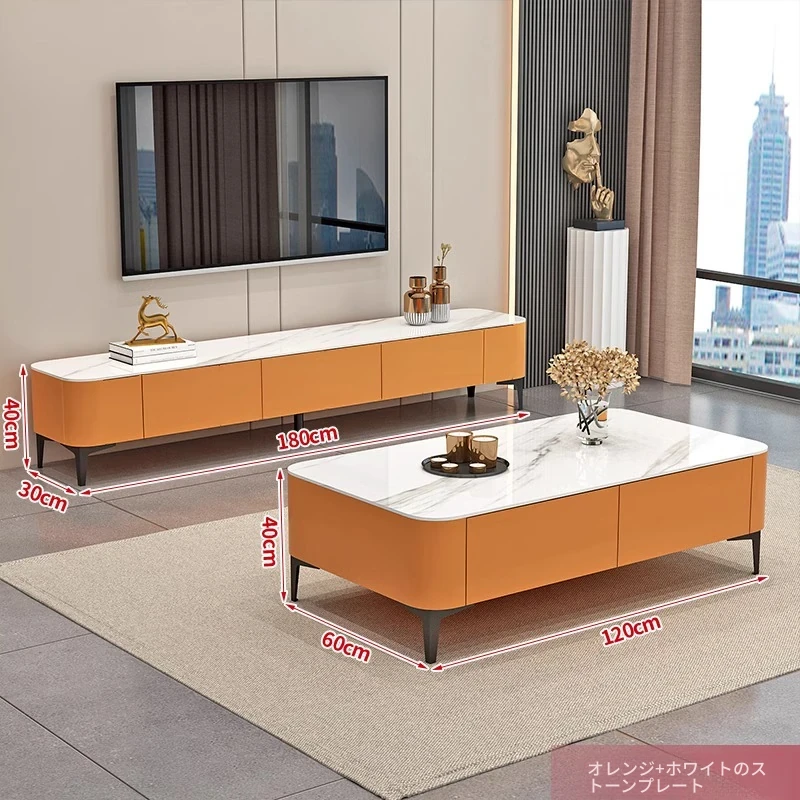 テレビ台1.8メートル+1.2メートルのコーヒーテーブル【オレンジ+白色の丸角の岩板】