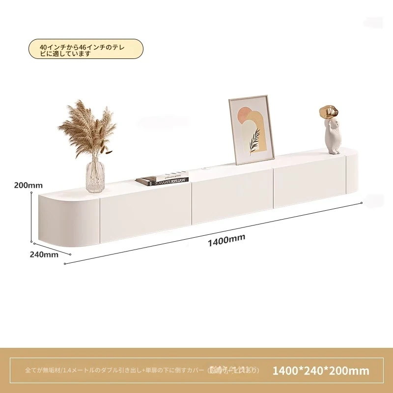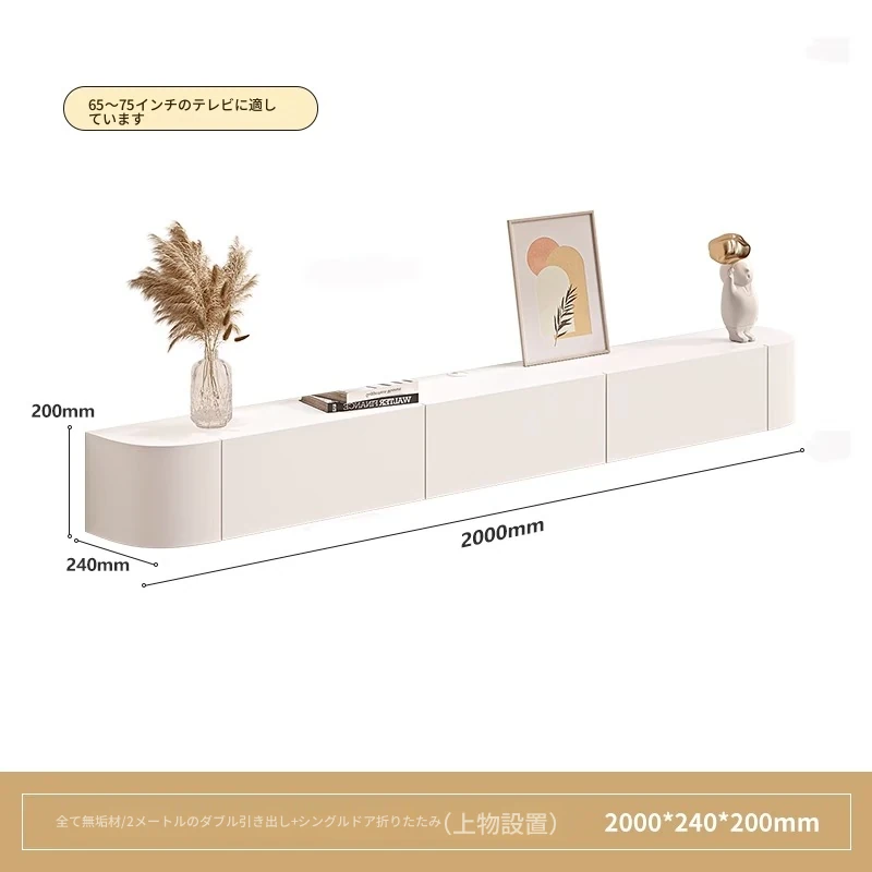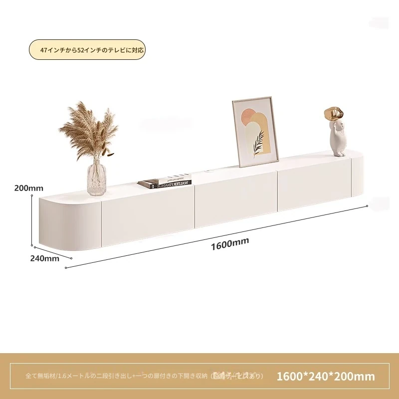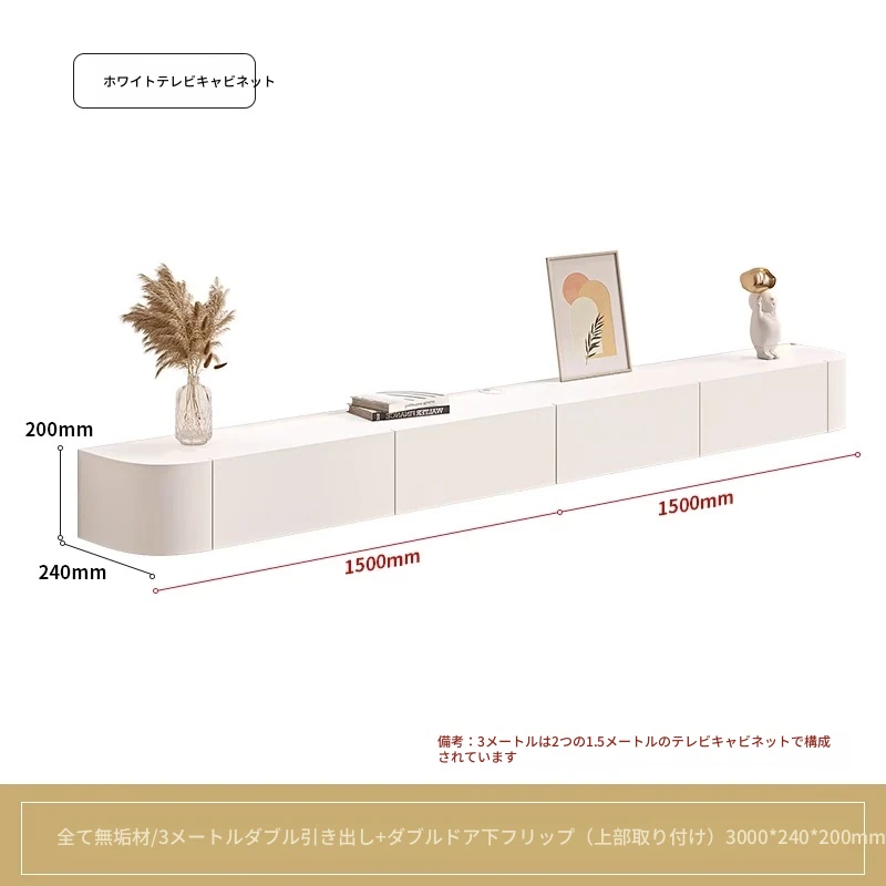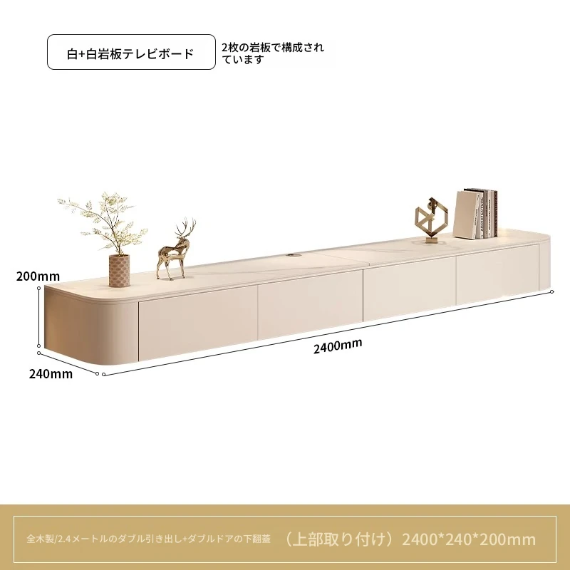 2.4m丸角テレビキャビネット-白-岩板白 (壁取り付け無料)