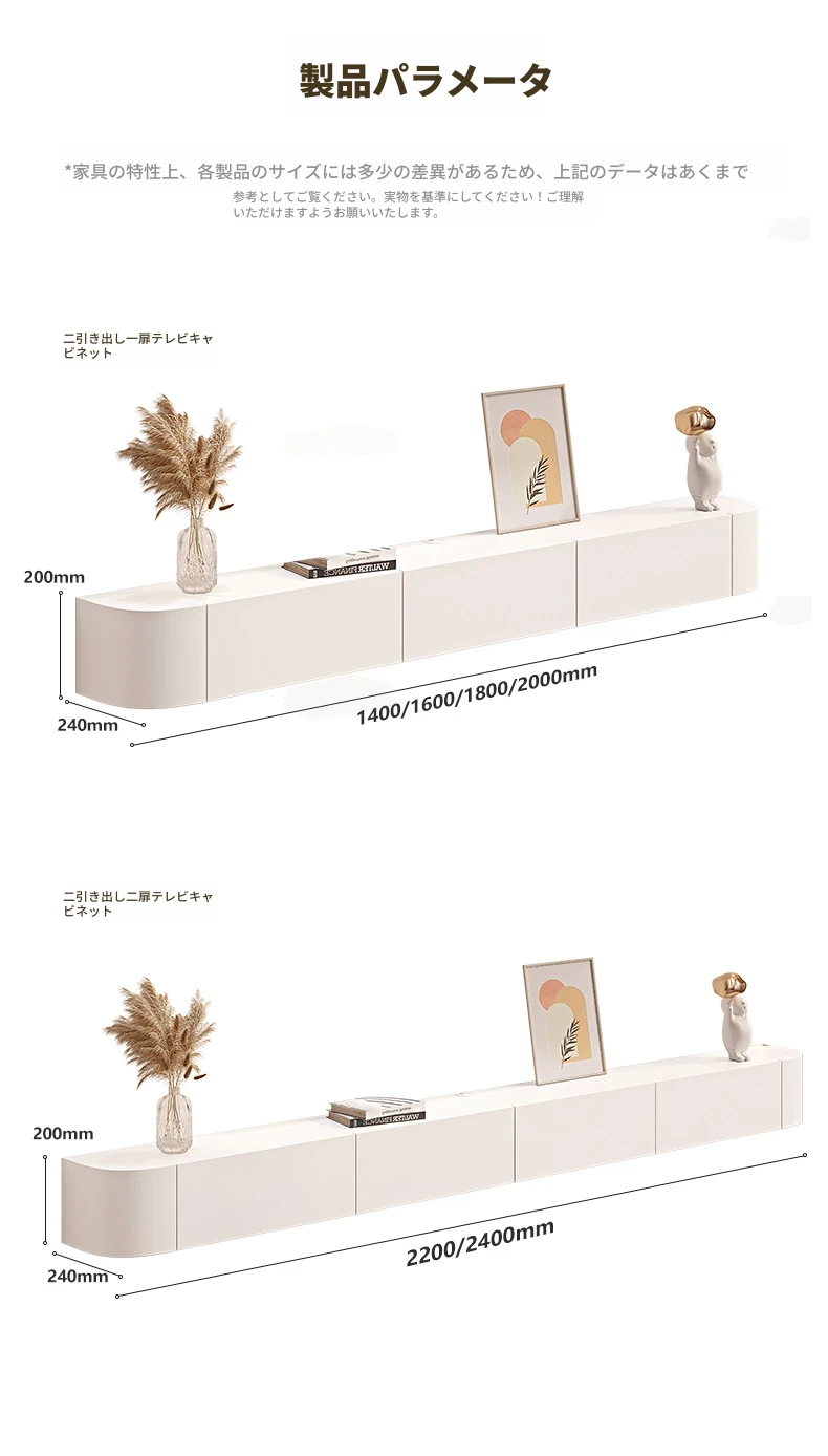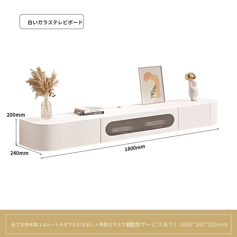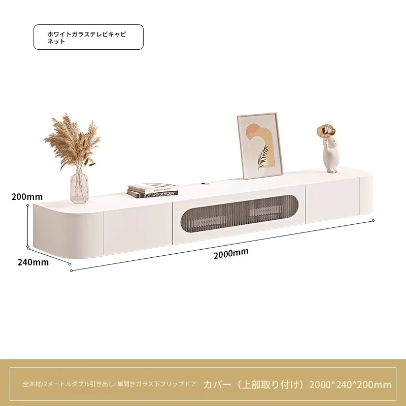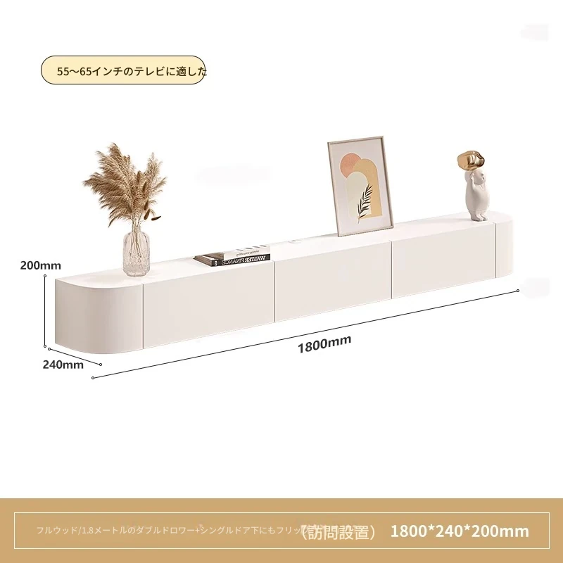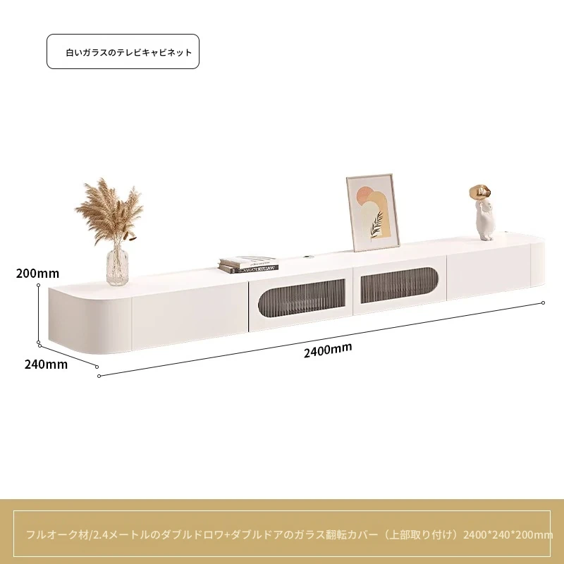 2.4m丸角テレビキャビネット-白-岩板白 (壁取り付け無料)
