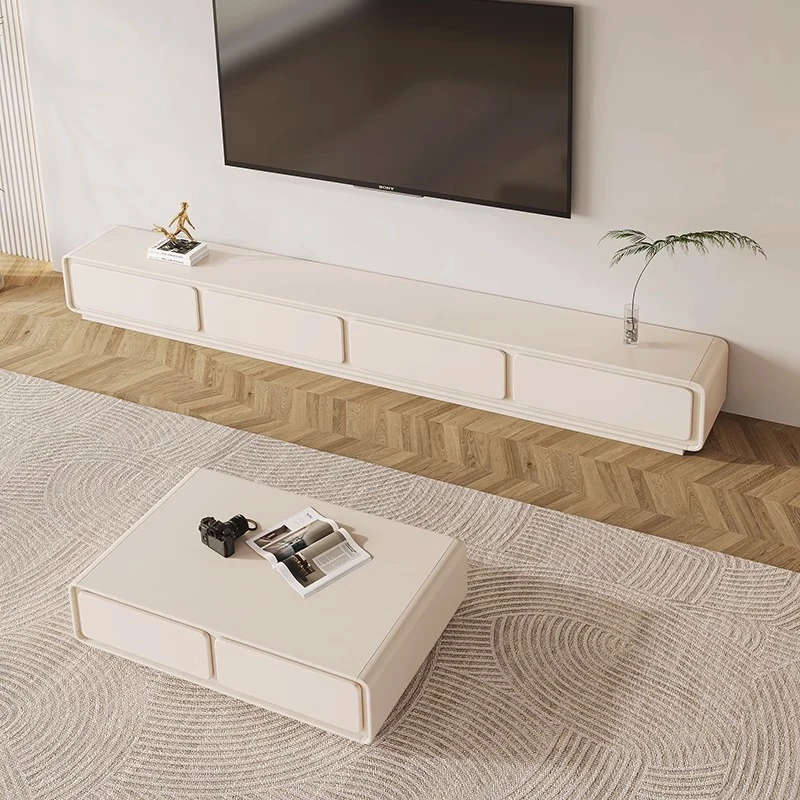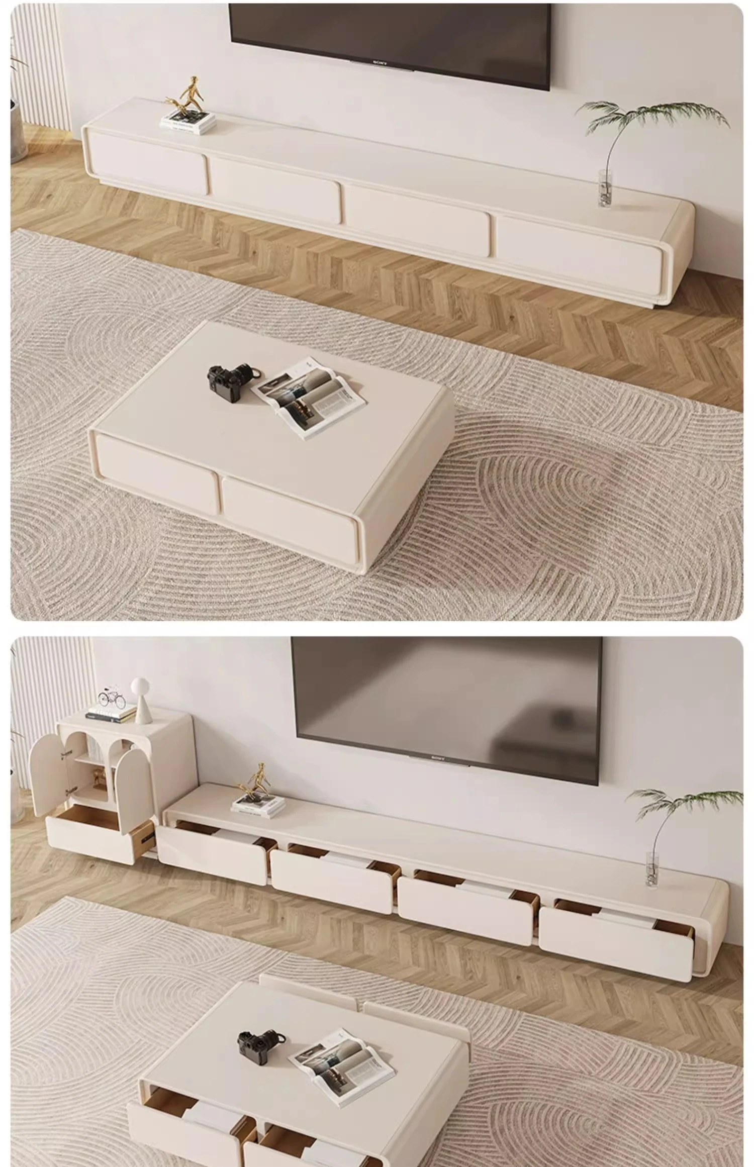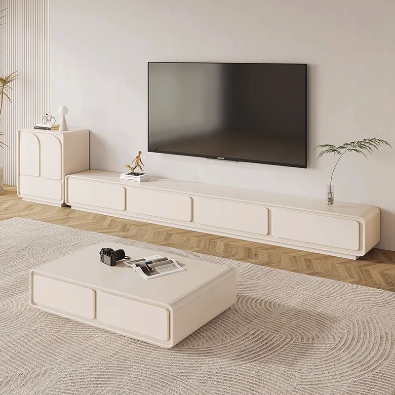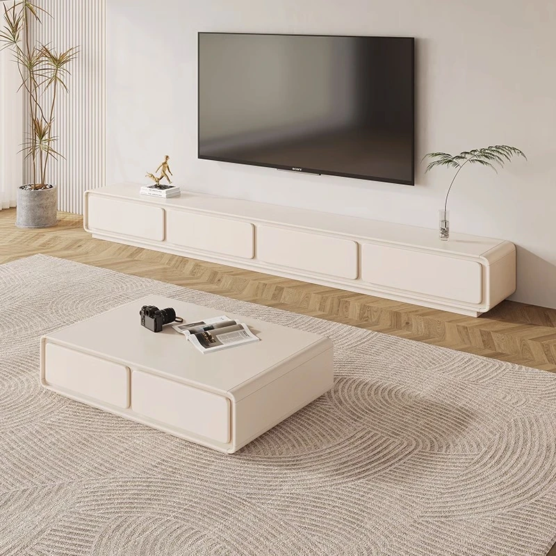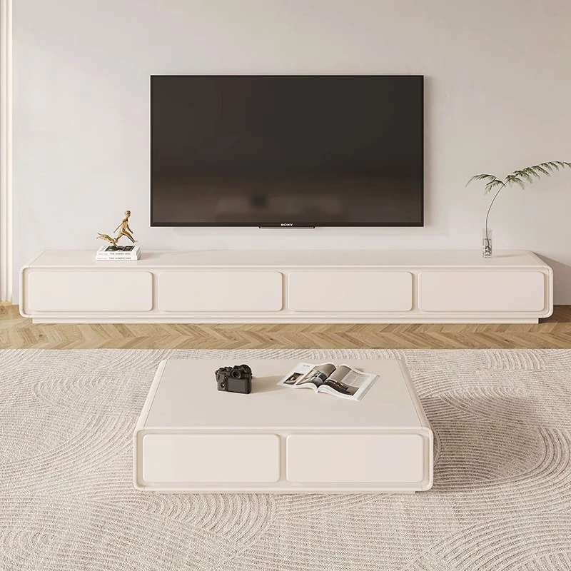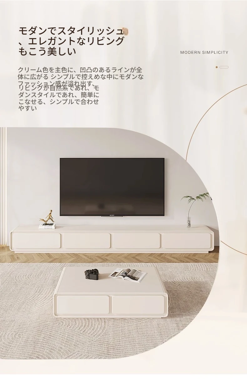 オーヤ・イッカの侘寂スタイルクリームテレビボードとシンプルモダンのコーヒーテーブルセット - 小さなリビングルームに最適なラグジュアリーなミニマリズムを実現!