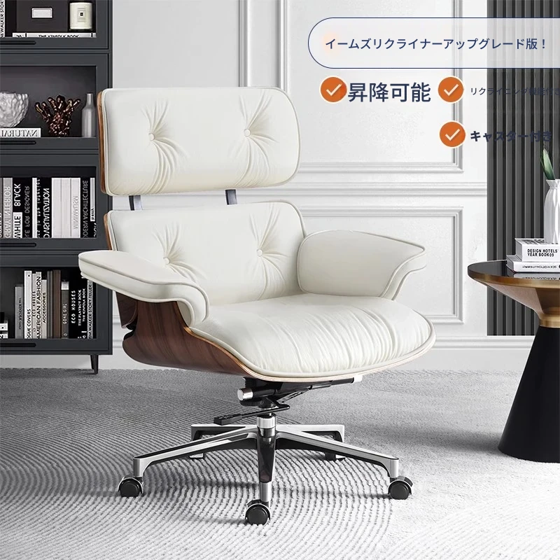 アイボリー(ウォールナット色)トップグレインレザー--キャスター付きオフィスチェア
